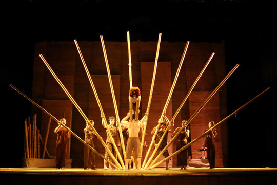 Photo : Nguyen Phuong.Comment ne pas être sensible à la beauté de la mise en scène ? D’une simplicité extrême : une toile de fond en lamelles de bois qui laisse parfois deviner des ombres, des morceaux de bambous, de toutes tailles, qui sont successivement assemblés pour servir de décor ou de structure à une performance. Le bois marque ici son empreinte calme et sereine.