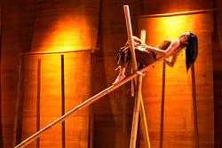 Le meilleur du spectacle est là, dans les évolutions de ces constructeurs de l’éphémère, en perpétuel (dés)équilibre : sur le sol de terre ocre, la construction de ces fragiles installations s’opère grâce aux corps souples, aériens, bondissants des jeunes circassiens vietnamiens. Elle permet toutes les figures acrobatiques possibles, et l’invention d’images fantastiques, comme celles de cette jeune contorsionniste qui évolue de branche en branche, troublante créature en qui on ne reconnaît plus ni l’homme ni l’animal, mais une étrange déclinaison des deux ensemble.